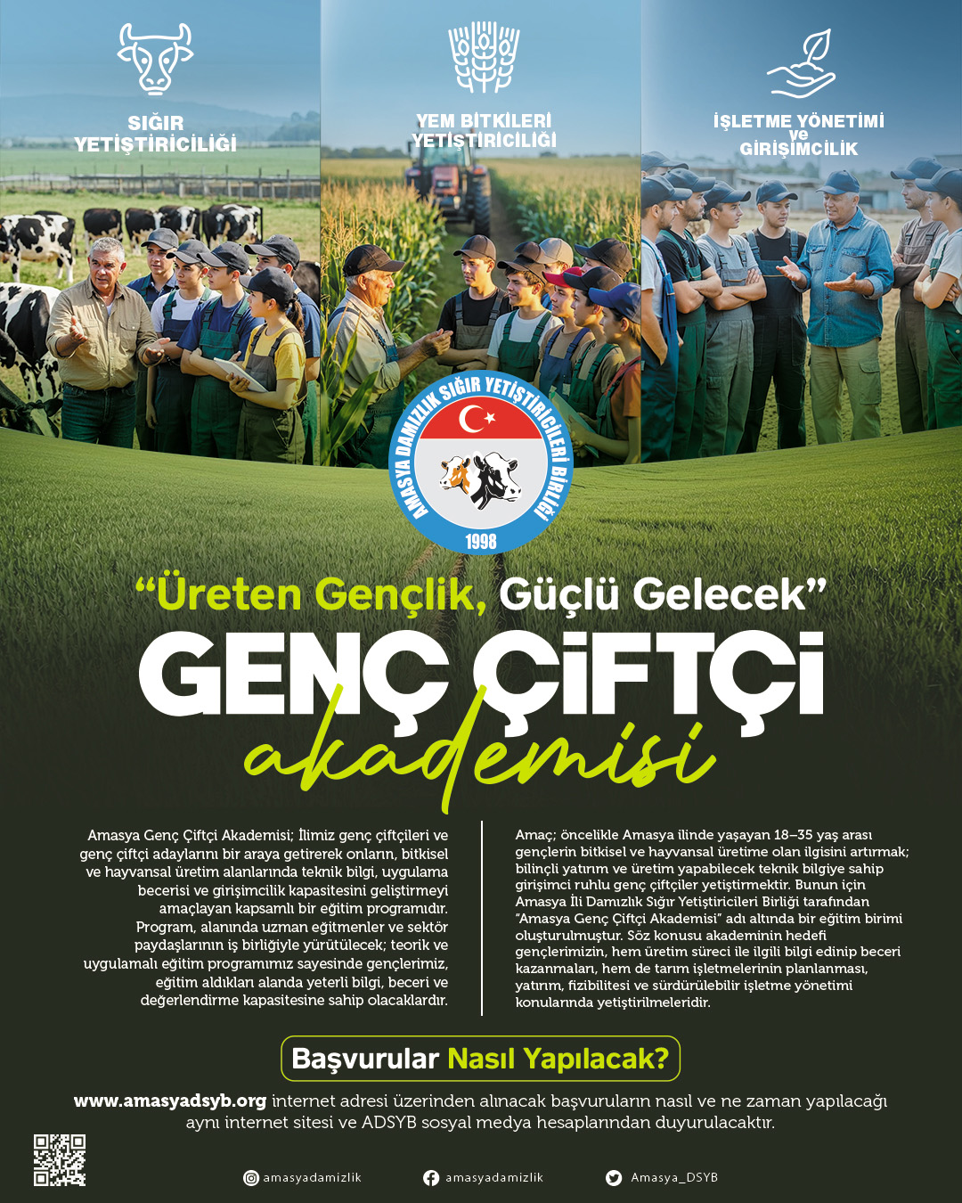 Amasya Genç Çiftçi Akademisi; İlimiz genç çiftçileri ve genç çiftçi adaylarını bir araya getirerek onların, bitkisel ve hayvansal üretim alanlarında teknik bilgi, uygulama becerisi ve girişimcilik kapasitesini geliştirmeyi amaçlayan kapsamlı bir eğitim programıdır.