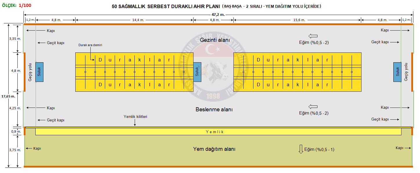 Hayvan ağırlığı (Kg.) Toplam durak uzunluğu (Kapalı cephe)(LSC) Toplam durak uzunluğu (Açık cephe)(LSO) Göğüs borusuna uzaklık(LB) Boyun korkuluğuna uzaklık(LN) Merkezden merkeze durak genişliği (WS) Durak bölme demiri üst yüksekliği (HP) Boyun korkuluğu yüksekliği (HN) Boyun korkuluğu yüksekliği (HB)