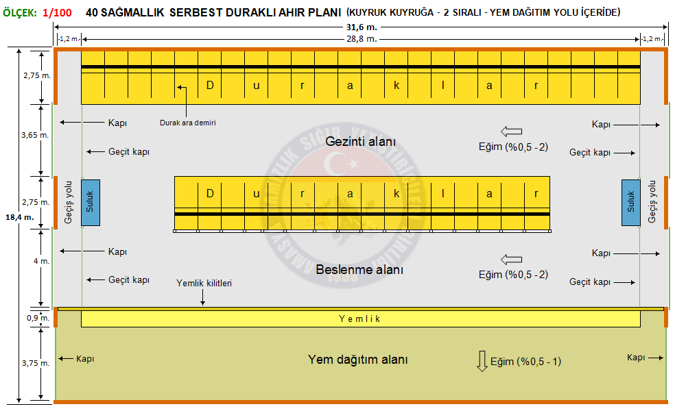 Hayvan ağırlığı (Kg.) Toplam durak uzunluğu (Kapalı cephe)(LSC) Toplam durak uzunluğu (Açık cephe)(LSO) Göğüs borusuna uzaklık(LB) Boyun korkuluğuna uzaklık(LN) Merkezden merkeze durak genişliği (WS) Durak bölme demiri üst yüksekliği (HP) Boyun korkuluğu yüksekliği (HN) Boyun korkuluğu yüksekliği (HB)