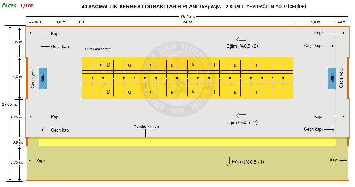 Hayvan ağırlığı (Kg.) Toplam durak uzunluğu (Kapalı cephe)(LSC) Toplam durak uzunluğu (Açık cephe)(LSO) Göğüs borusuna uzaklık(LB) Boyun korkuluğuna uzaklık(LN) Merkezden merkeze durak genişliği (WS) Durak bölme demiri üst yüksekliği (HP) Boyun korkuluğu yüksekliği (HN) Boyun korkuluğu yüksekliği (HB)