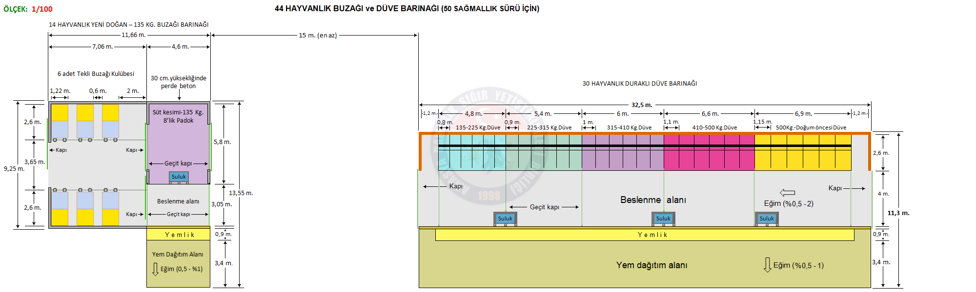 Hayvan ağırlığı (Kg.) Toplam durak uzunluğu (Kapalı cephe)(LSC) Toplam durak uzunluğu (Açık cephe)(LSO) Göğüs borusuna uzaklık(LB) Boyun korkuluğuna uzaklık(LN) Merkezden merkeze durak genişliği (WS) Durak bölme demiri üst yüksekliği (HP) Boyun korkuluğu yüksekliği (HN) Boyun korkuluğu yüksekliği (HB)